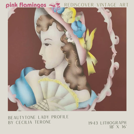 This offset lithograph shows Terone’s signature delicate portrait work in a striking Dubonnet red tone, adding a richer warmth to the soft airbrushed details. Offered in mint-condition new vintage — never framed, never displayed, stored flat for decades.