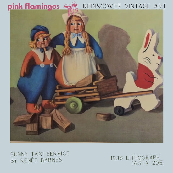This original offset lithograph, printed in 1936, captures a moment of quiet imagination—two Dutch-style dolls being towed in a wooden bunny cart. Part surreal, part sweet, it’s a perfect example of 1930s American nursery art by Reneé Barnes, known for her charming scenes of childhood play.