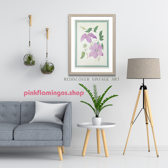 Pairing Ideas: Pair Clematis with other Dorothy Platt prints like Hibiscus, Angel Wing Begonia, Bignonia Venusta, Buseri Phaseolus, or Geranium to create a charming mid-century floral wall.