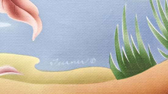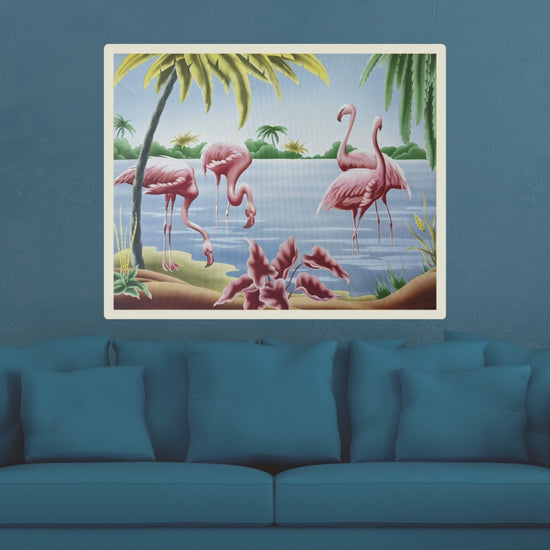 This is the pink flamingo wall art that defined an era — a stunning 1940s offset lithograph originally produced by Turner Decorative Accessories and painted by artist A.T. Toran. Known for its vivid colors and dreamy tropical landscape, this vintage masterpiece captures the retro kitsch aesthetic that became synonymous with mid-century decor.
