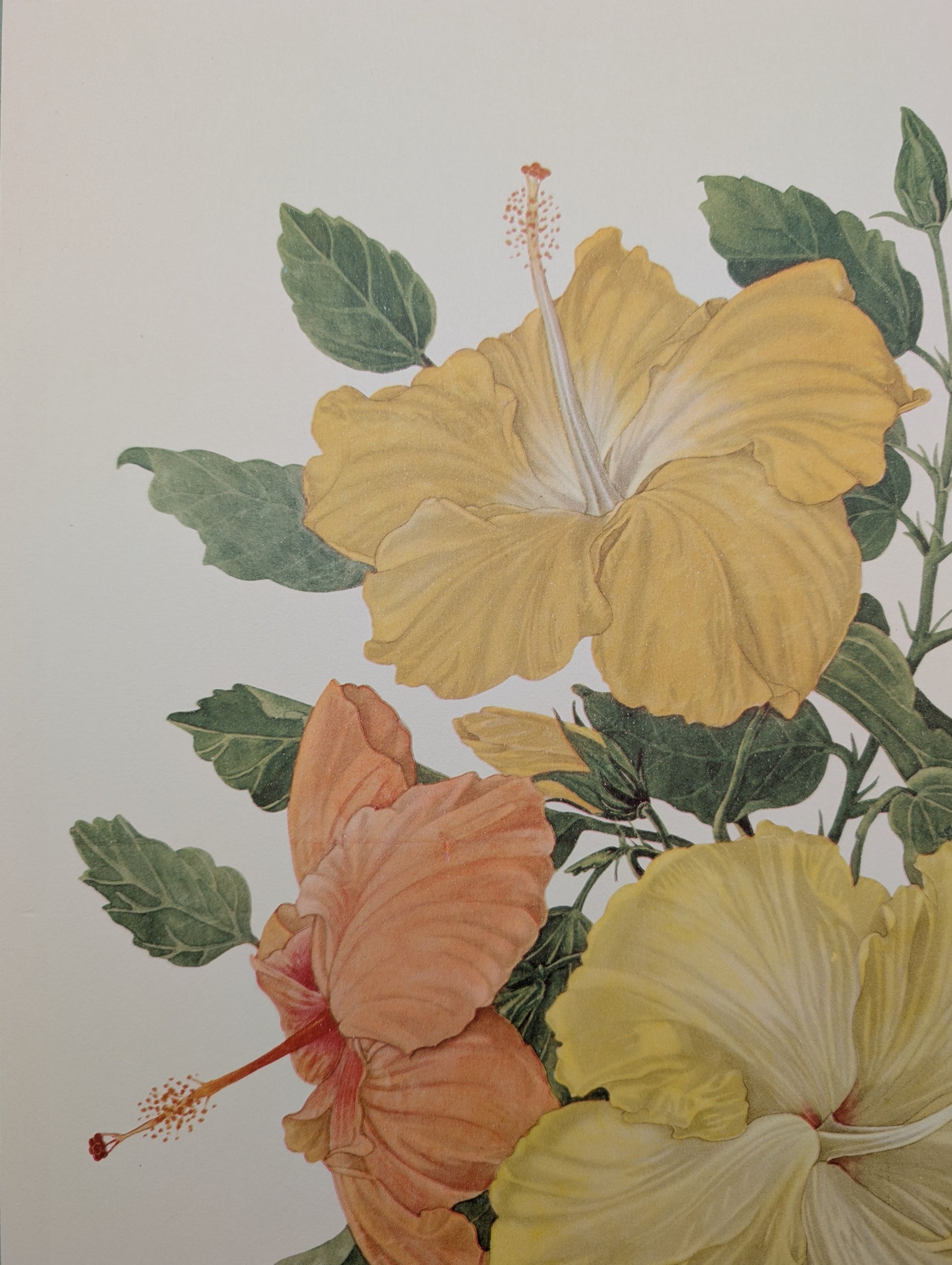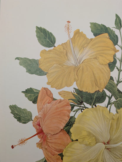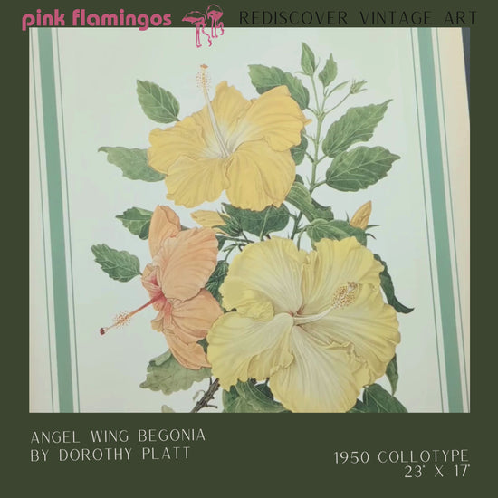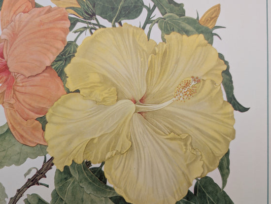 Hibiscus by Dorothy Platt is a lush vintage botanical collotype printed in 1950, showcasing bold, tropical hibiscus blooms in soft peach, buttery yellow, and sunny gold. Celebrated for their large, showy petals and vibrant garden appeal, hibiscus flowers bring an instant splash of tropical charm — beautifully captured in Platt’s crisp mid-century study.