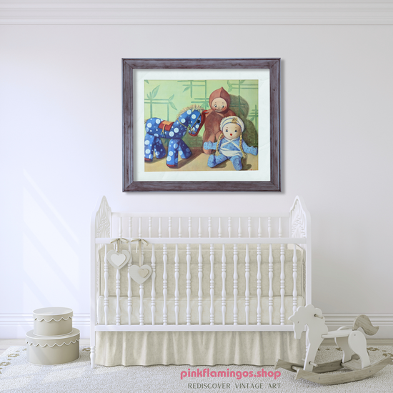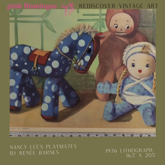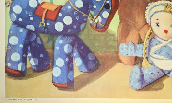 This original offset lithograph, printed in 1936, depicts three charming vintage toys: a blue polka-dot stuffed horse, a doll in a brown hooded bodysuit, and a blond-braided girl doll dressed in soft blue and white. Set against a pale green bamboo-patterned backdrop, this artwork feels like a window into a childhood from long ago—perfect for a nostalgic nursery or vintage-themed gift.