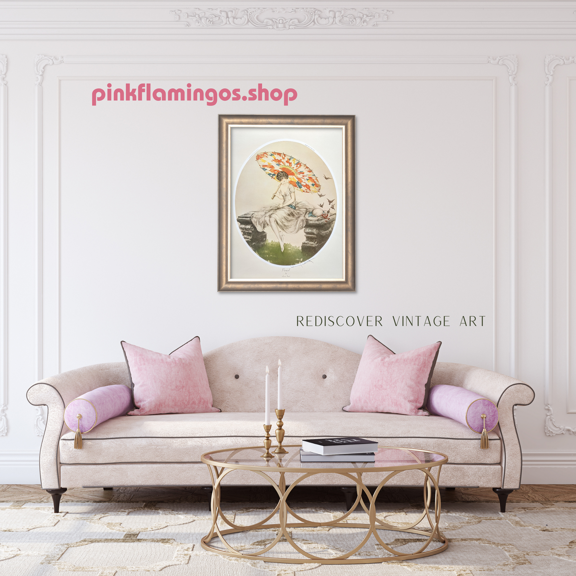 Parasol pairs beautifully with Secrets, another soft-toned 1970s Icart lithograph featuring quiet intimacy and feminine grace. Together, they create a timeless and romantic display for dressing rooms, bedrooms, or any elegant interior.