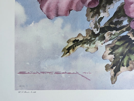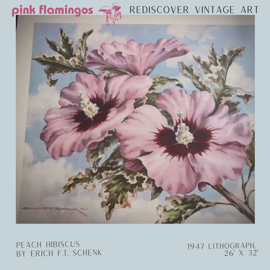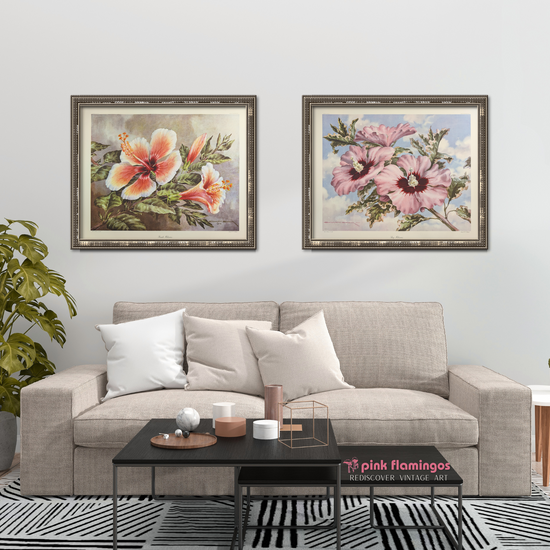 For a bold floral statement, display Sky Hibiscus alongside Schenk’s Pink Hibiscus (1947). The complementary tones and shared tropical theme make them an ideal vintage pair for living rooms, dining spaces, or sunrooms.