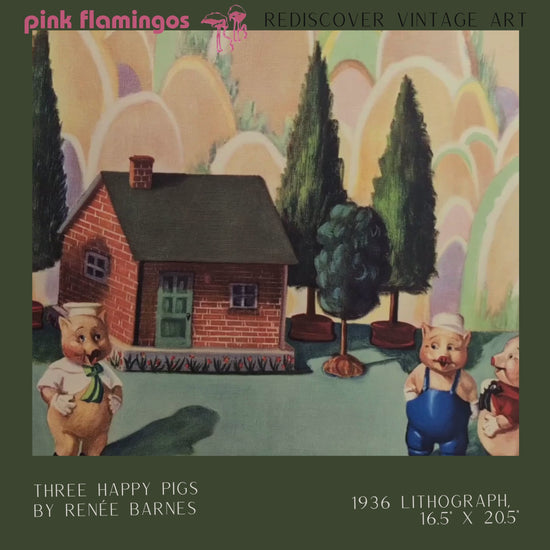This original offset lithograph, printed in 1936, captures the final moment of the beloved tale, The Three Little Pigs. All three pigs stand smiling outside their sturdy brick house—one in blue overalls, one in a red shirt with a green tie, and the third in white and green. Behind them, soft spring pastels form a stylized forest of evergreen trees and abstract foliage.