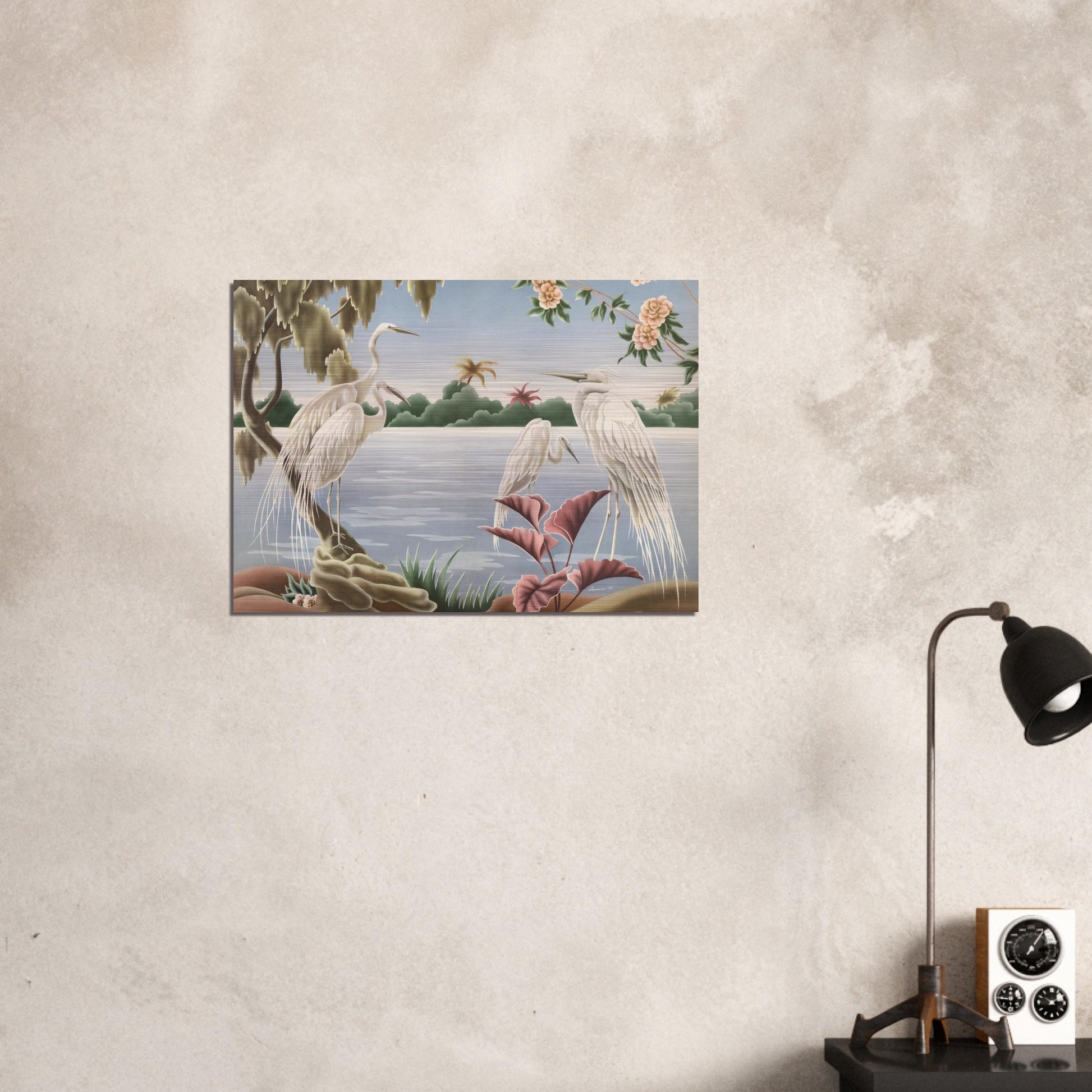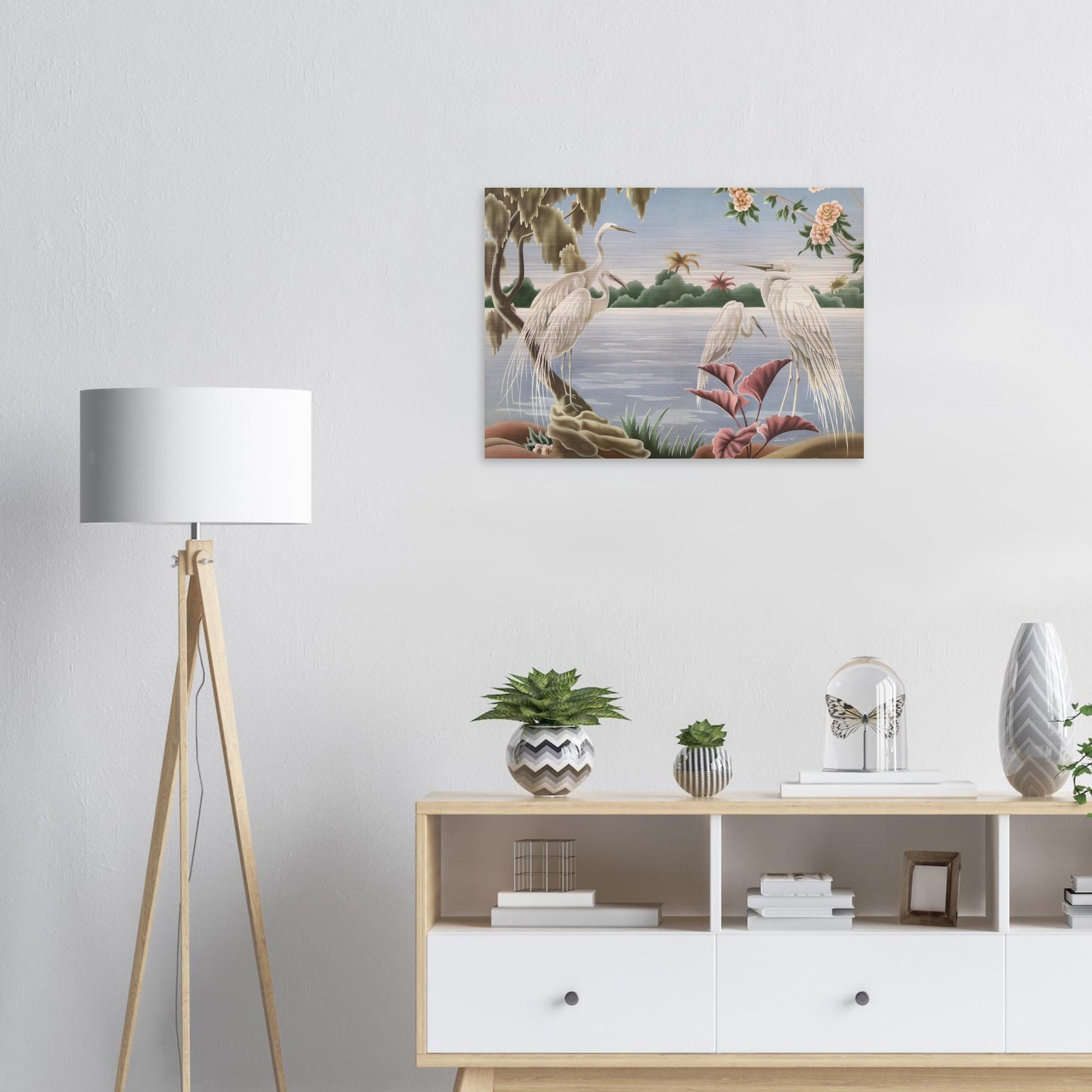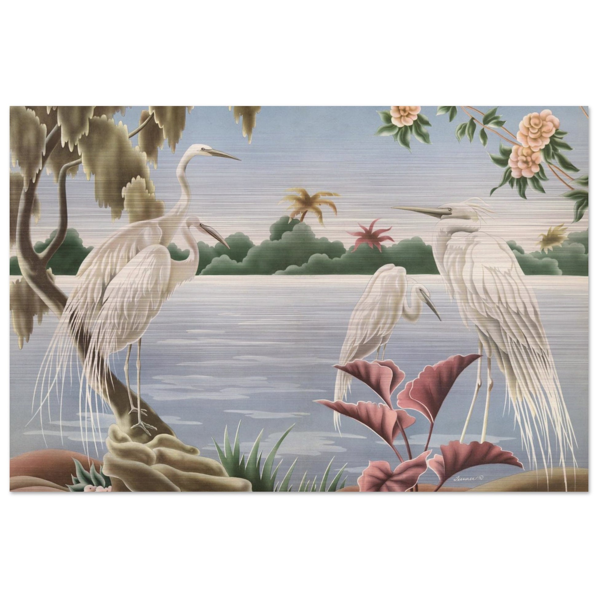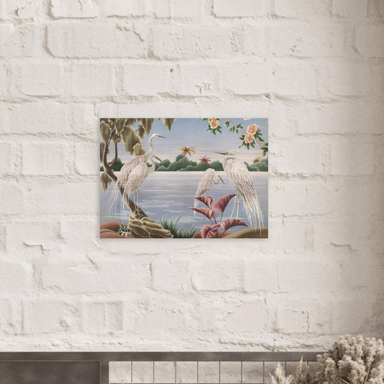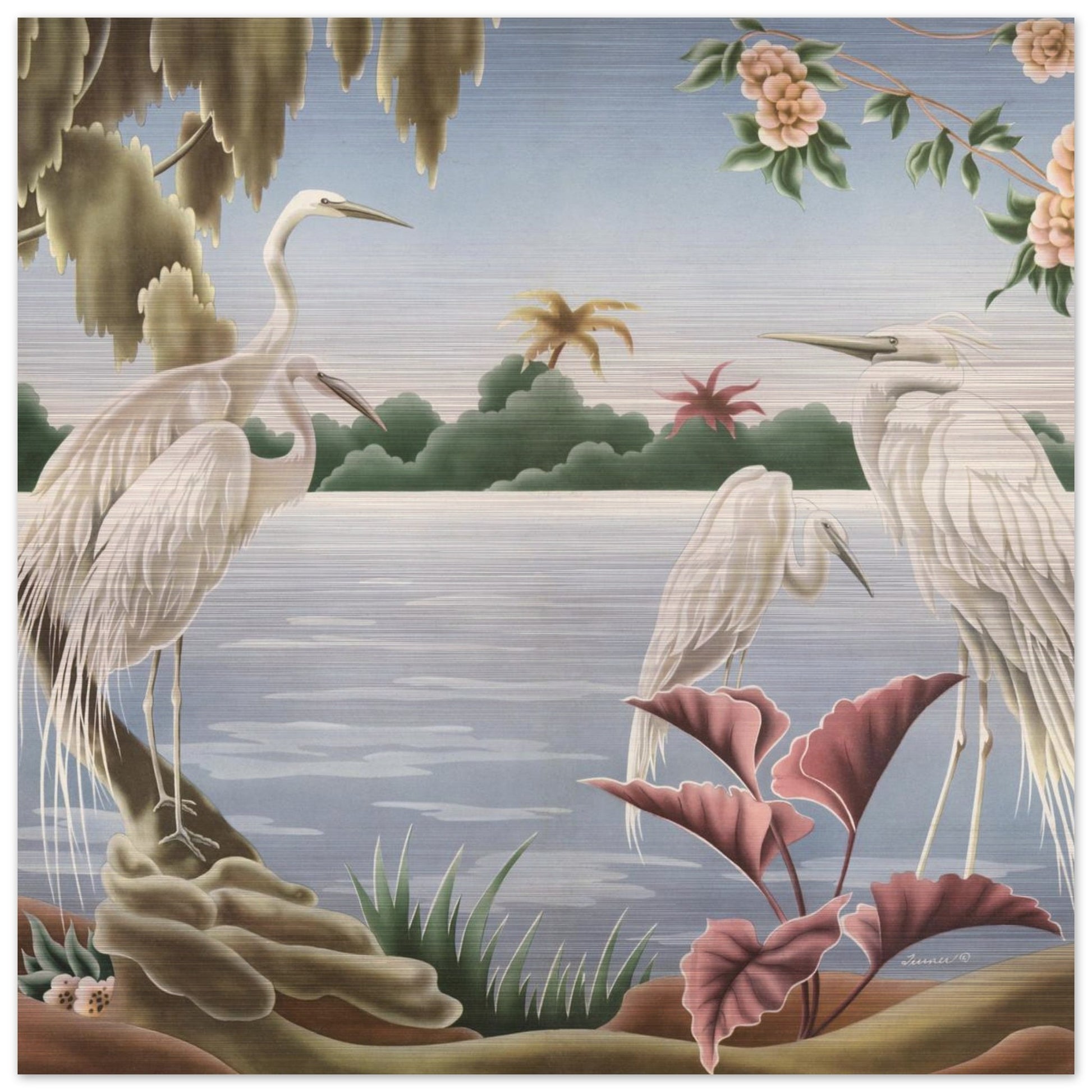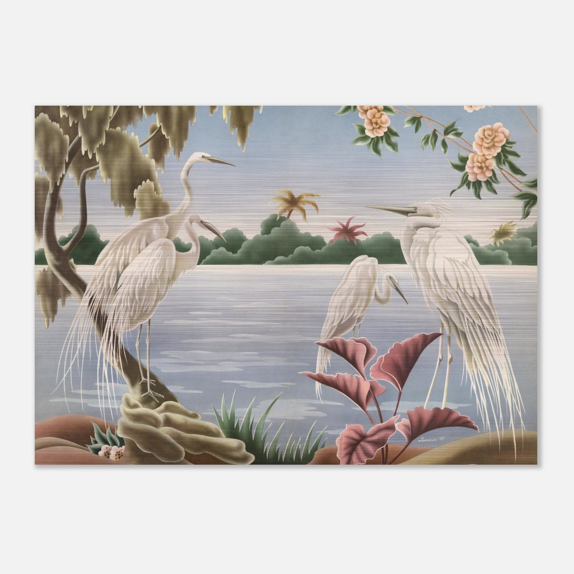 Printed directly onto brushed silver aluminum, the egrets' delicate white plumage and wetland setting interact with the metallic surface to create depth and subtle shimmer. Unprinted white areas reveal the brushed silver beneath, allowing the birds to appear almost luminous against the naturalistic background—a stunning interplay between vintage ornithology and modern materials.