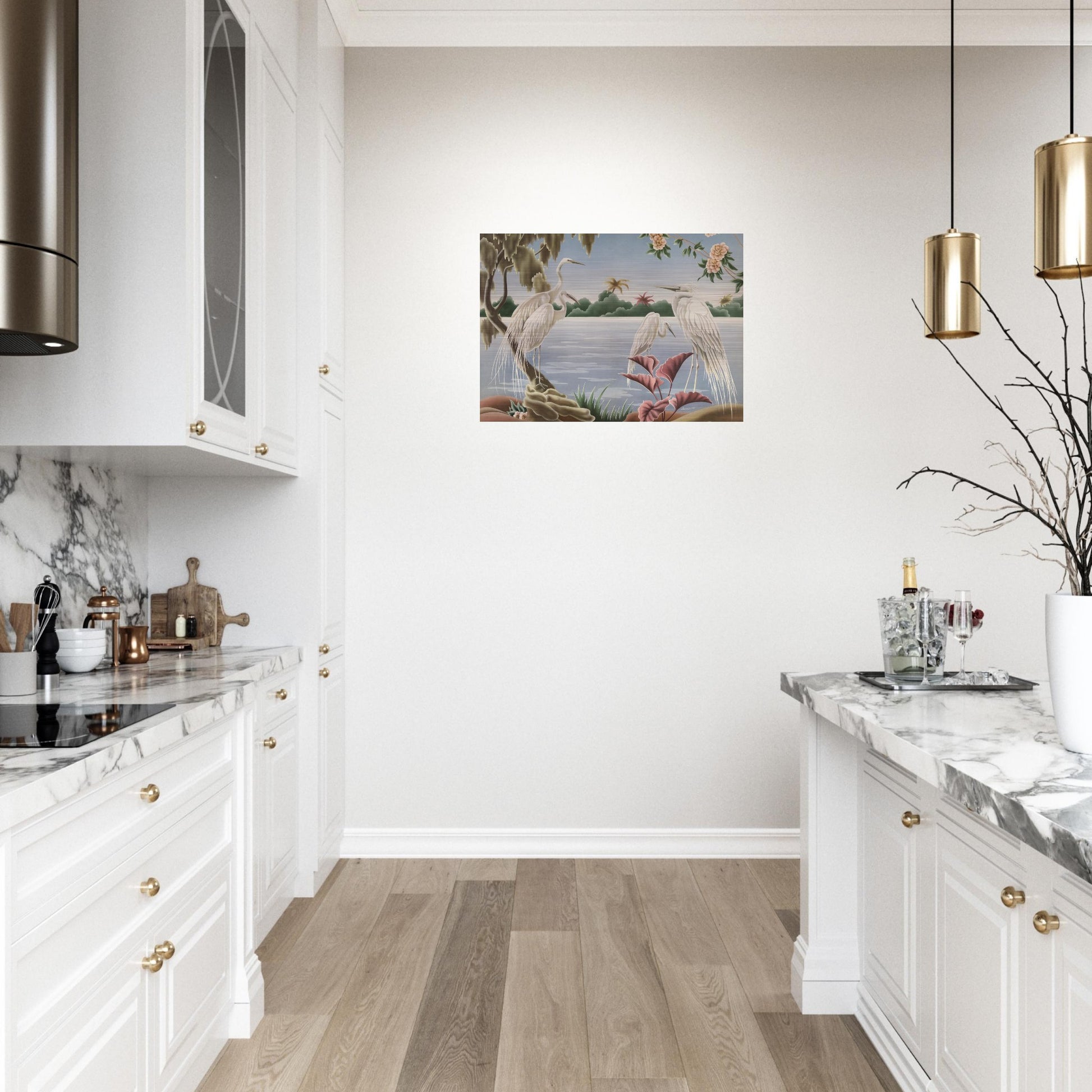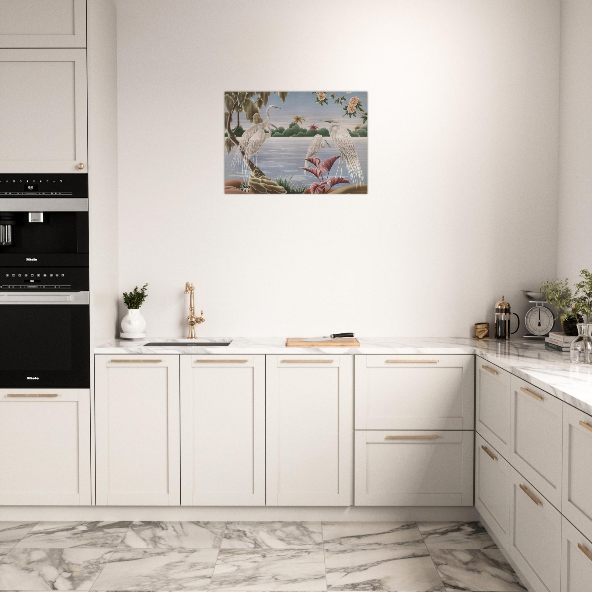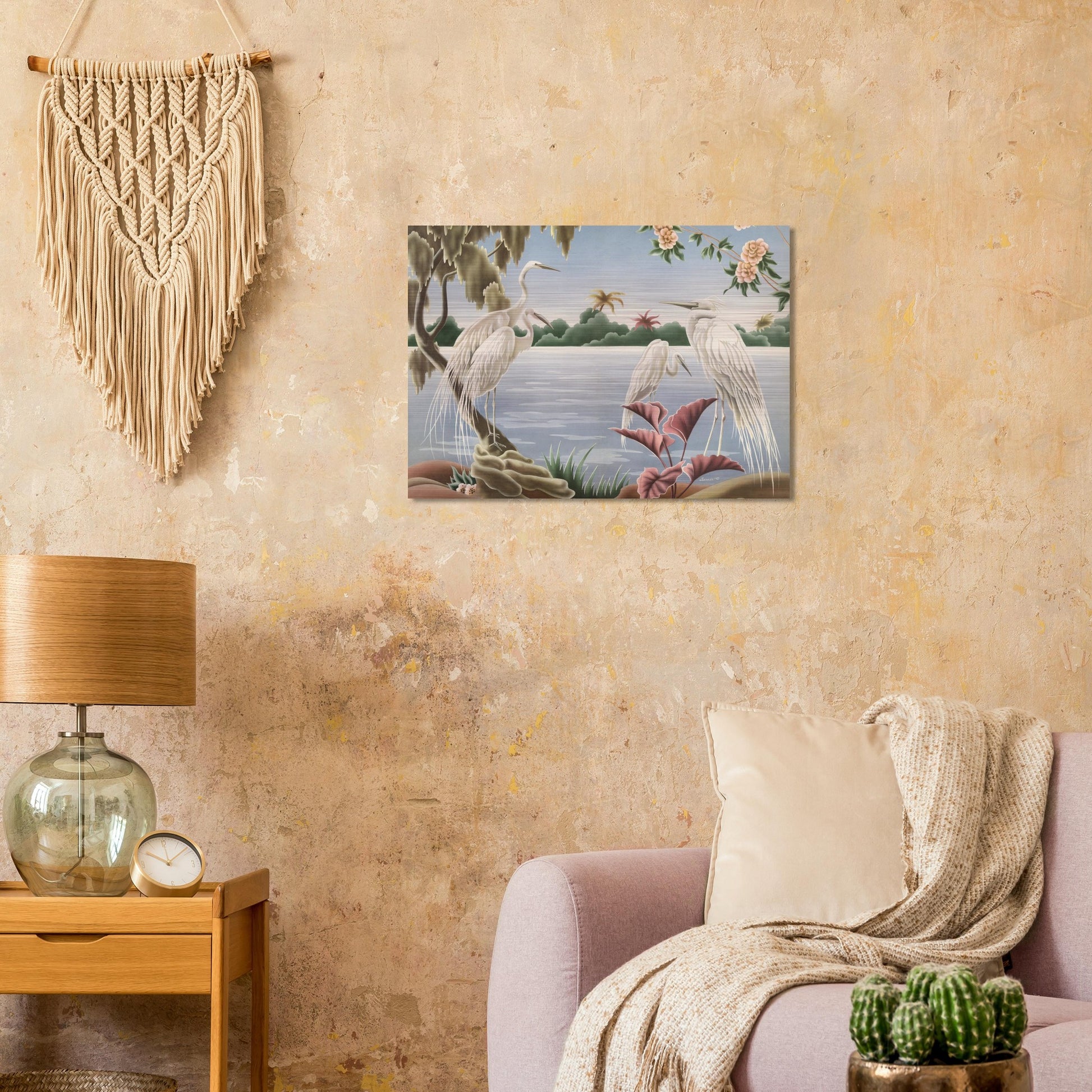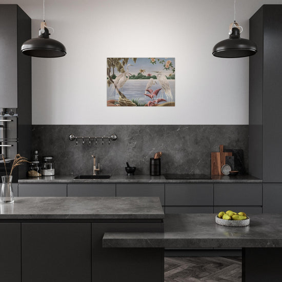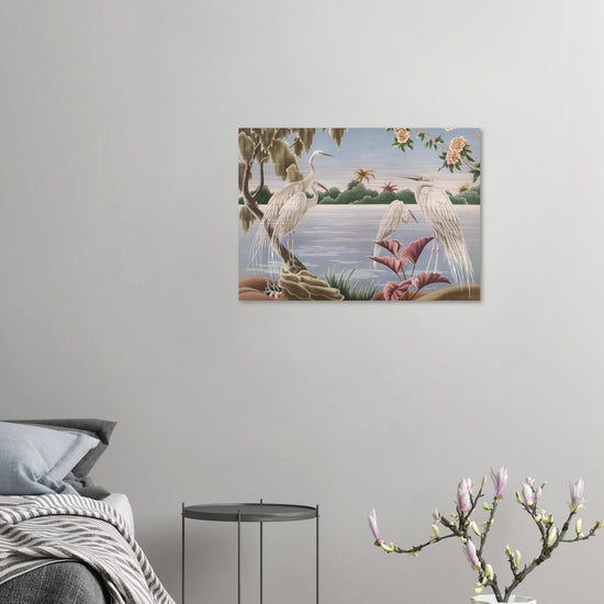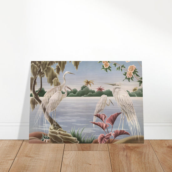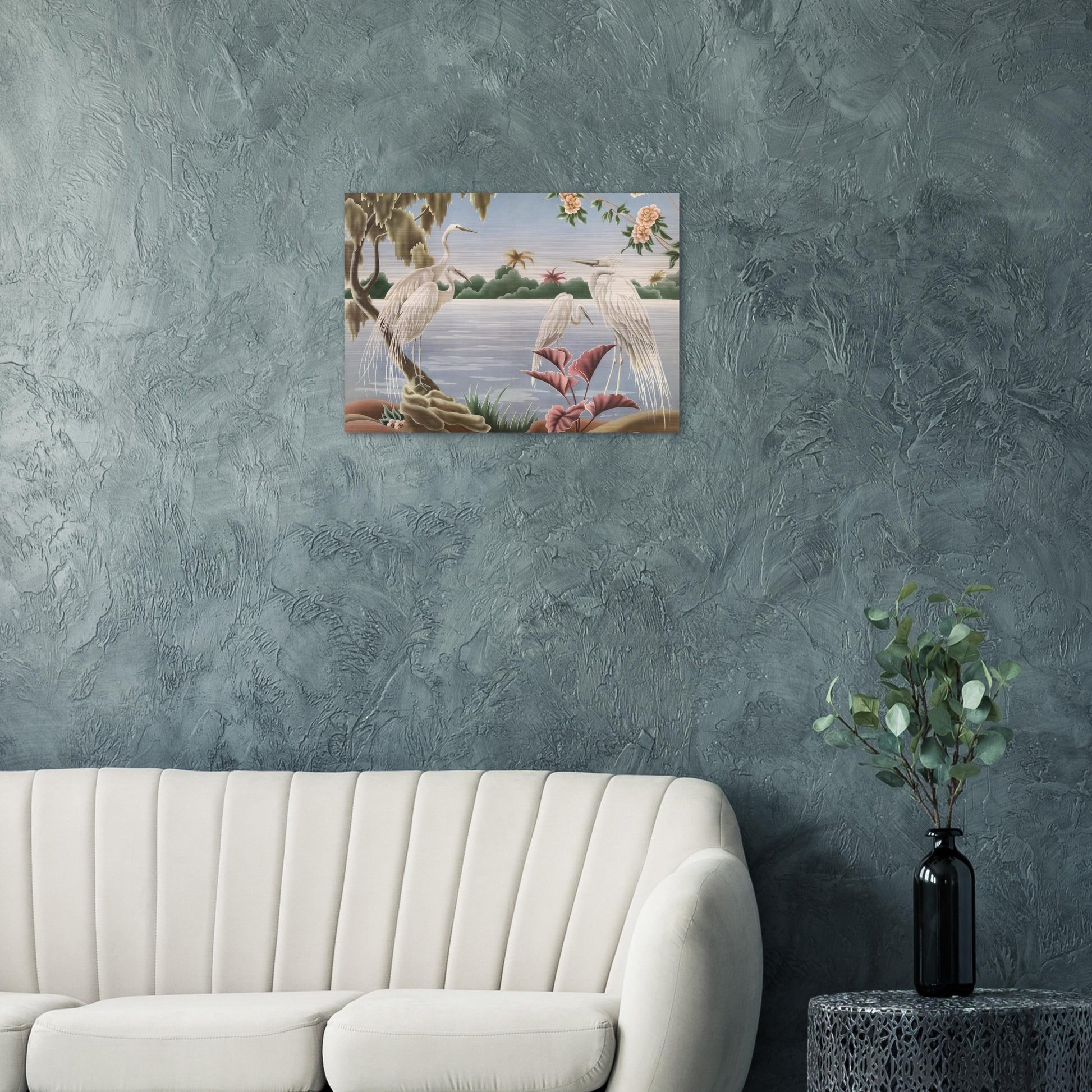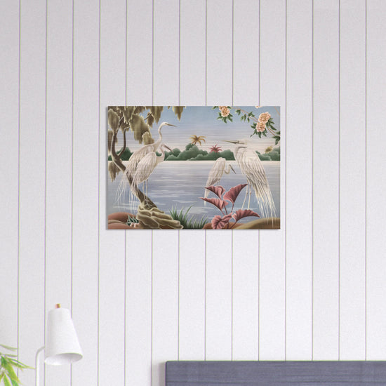 Printed directly onto brushed silver aluminum, the egrets' delicate white plumage and wetland setting interact with the metallic surface to create depth and subtle shimmer. Unprinted white areas reveal the brushed silver beneath, allowing the birds to appear almost luminous against the naturalistic background—a stunning interplay between vintage ornithology and modern materials.