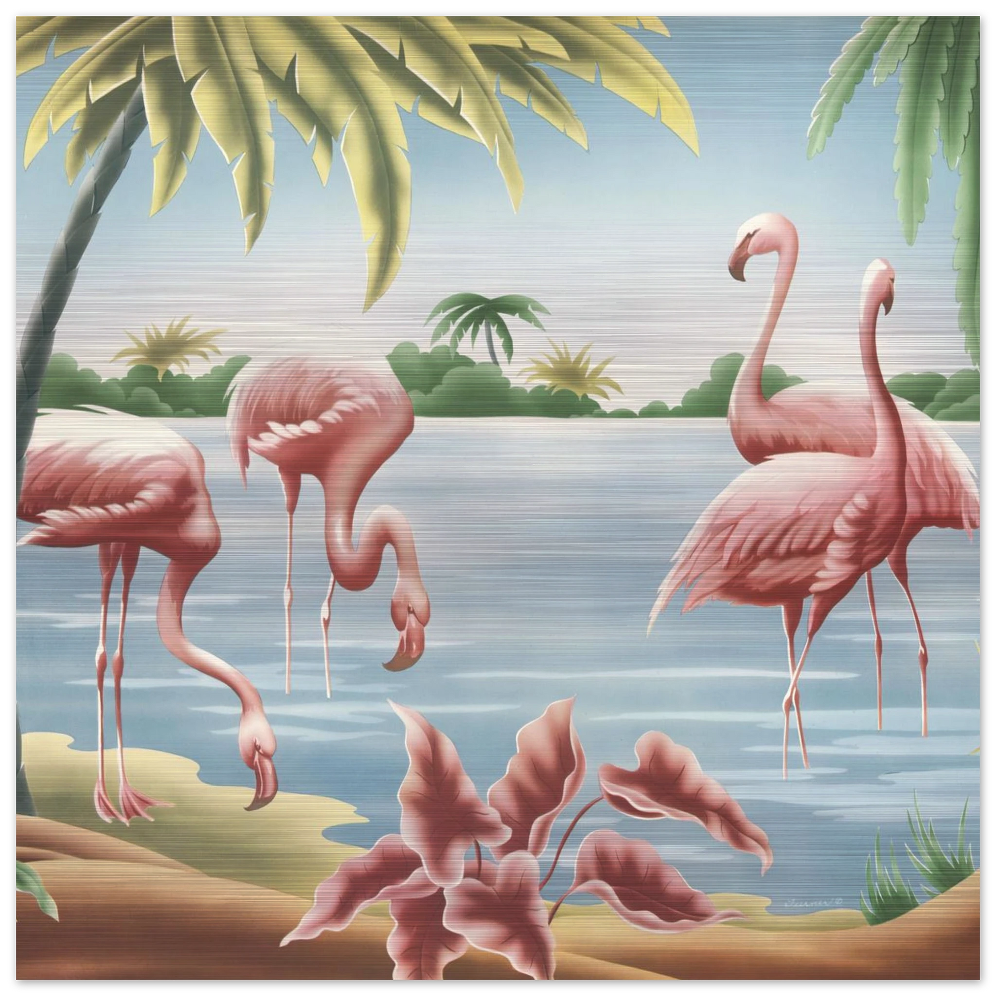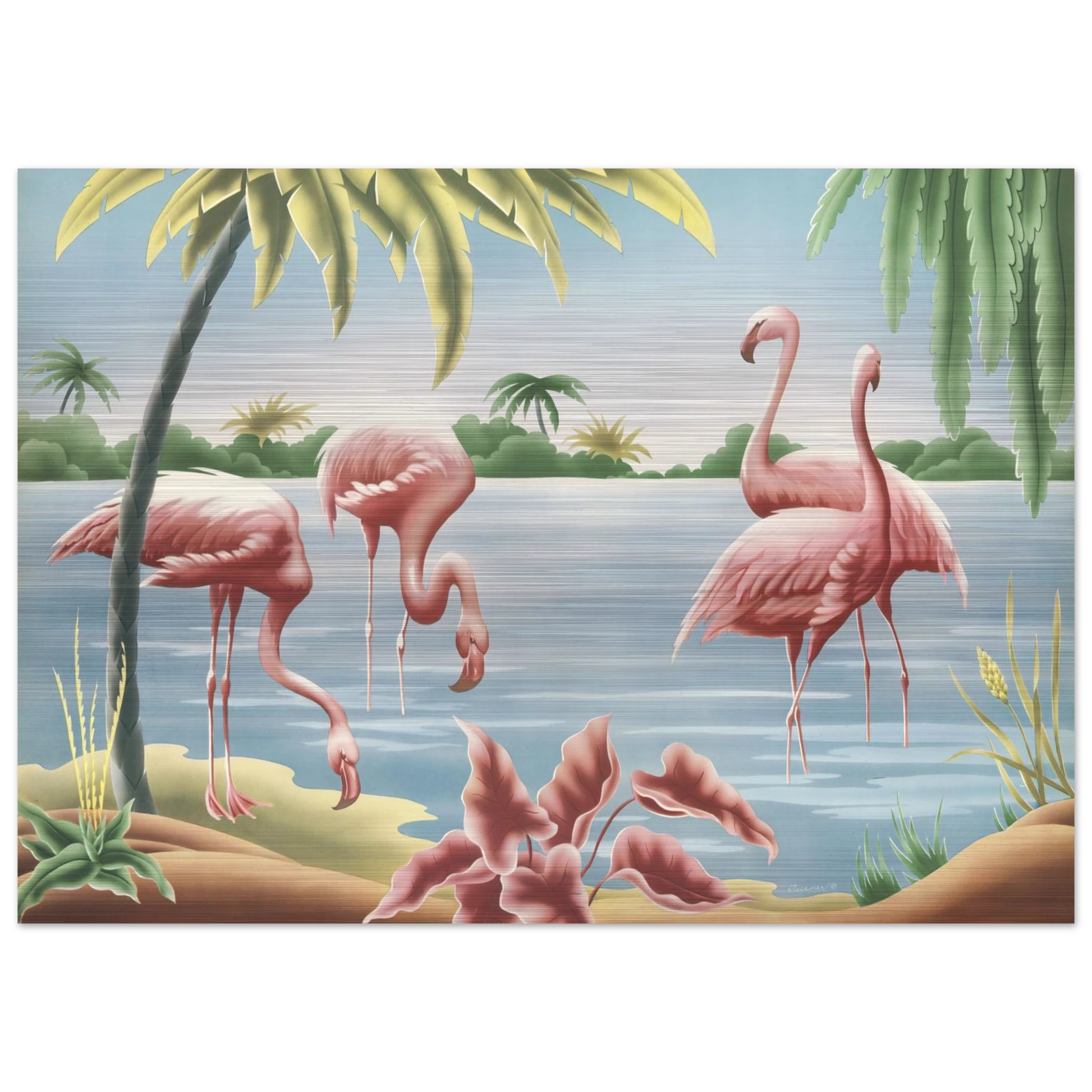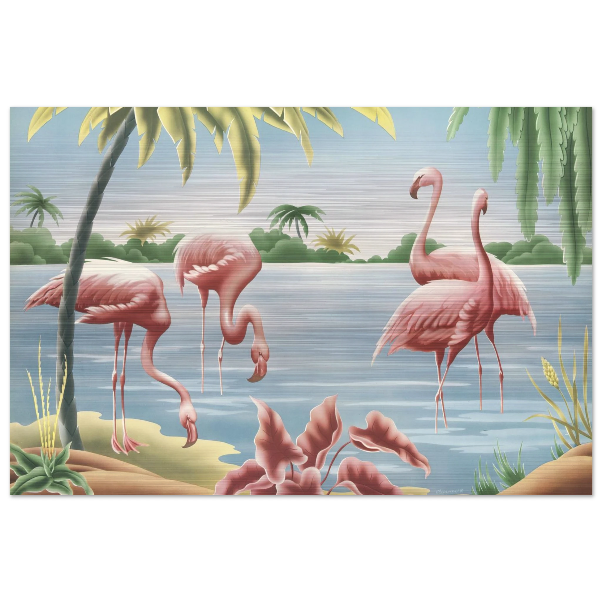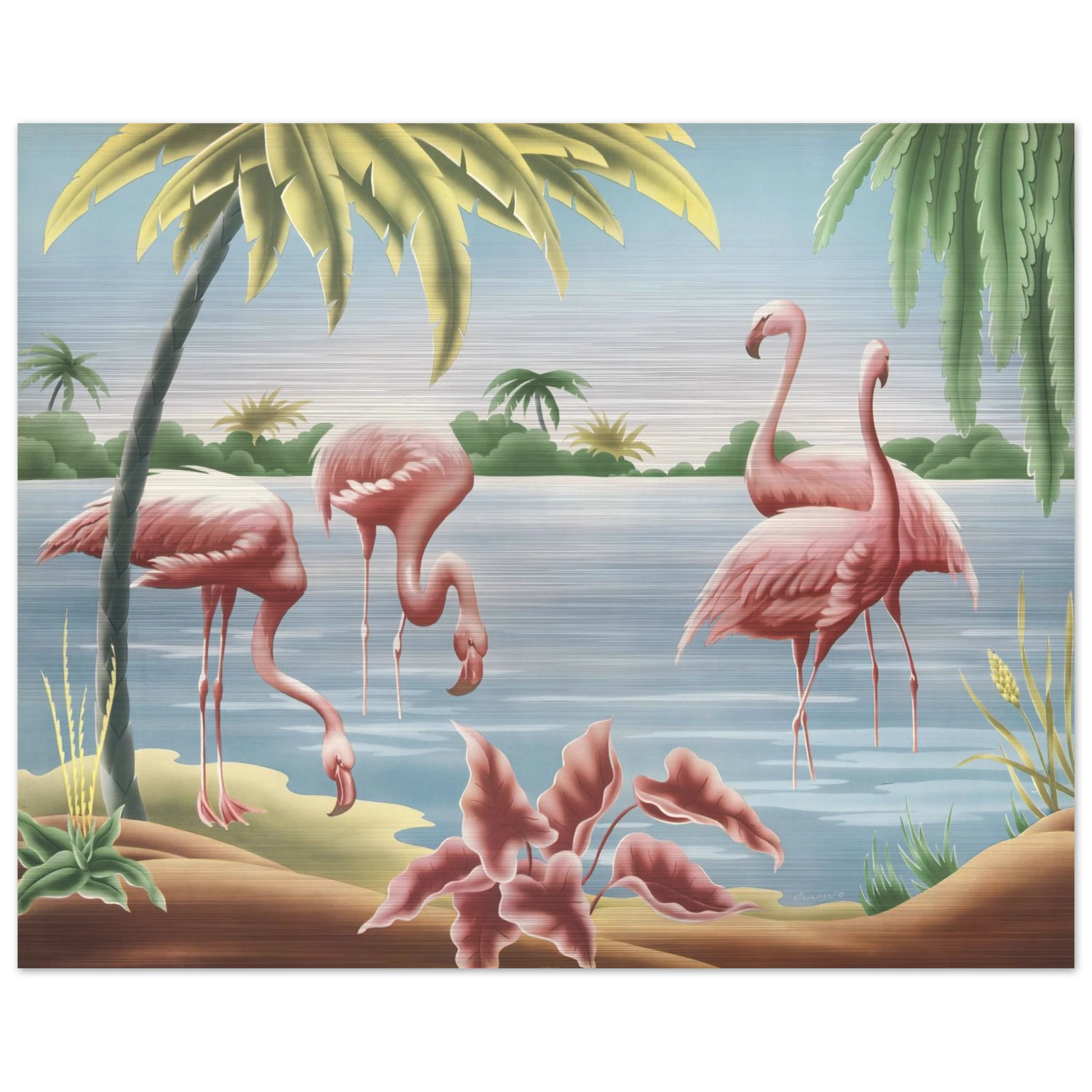 Bring museum-quality vintage art into your modern space with this brushed aluminum reproduction of A.T. Toran Turner's iconic flamingo lithograph. Originally created in the mid-20th century, this striking tropical bird print captures the elegance and vibrant detail that made Turner's work a staple of American decorative art—now reimagined on industrial metallic substrate.