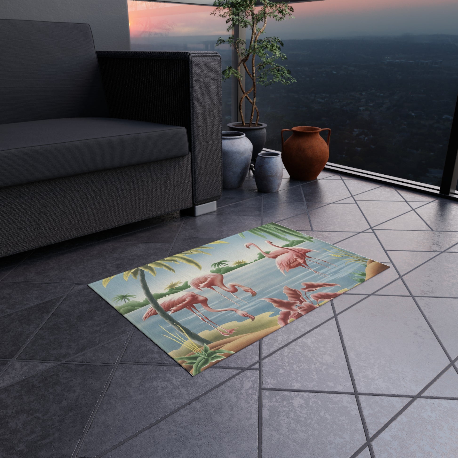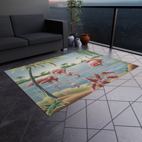 Bring a slice of sun-soaked retro paradise to your porch, patio, or poolside with this plush outdoor rug inspired by vintage Turner bird lithographs. Soft chenille piles invite bare feet while the saturated design captures the naturalist beauty of A.T. Toran's 1950s flamingo prints, setting a relaxed, playful mood. Weather-ready construction and a no-skid backing mean the rug stays put during barefoot mornings, backyard gatherings, or lazy afternoons with a cold drink. Hemmed edges and vivid dye ensure the image stays crisp and bright season after season. Lay it under a bistro table, in front of a sliding door, or beside a lounge chair to turn ordinary moments into a small, joyful escape.