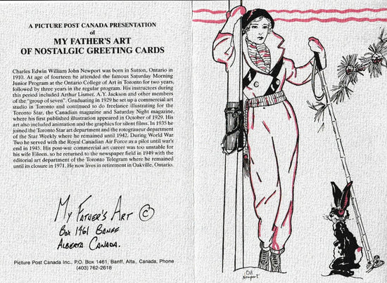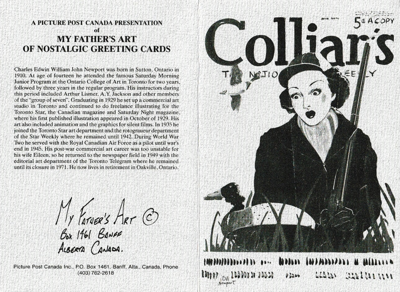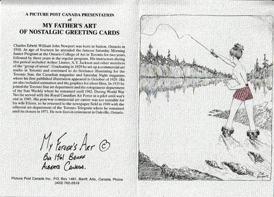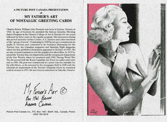 ⇒This set of six vintage art greeting cards is one of the most recently produced items we stock as it was printed in the early 1990's. At that time, my mother corresponded with the owner of Picture Post Canada, William Donald, who put together this collection after learning about the artwork of Canadian William (Bill) Newport by Newport's son, a close friend and associate of Mr. Donald. After reviewing hundreds of Mr. Newport's art pieces, Mr. Donald selected these six to publish in the greeting card set. Mr. Newport's art has the distinct styles of the 1920s, 30s, and 40s, during which he produced much of his artwork.