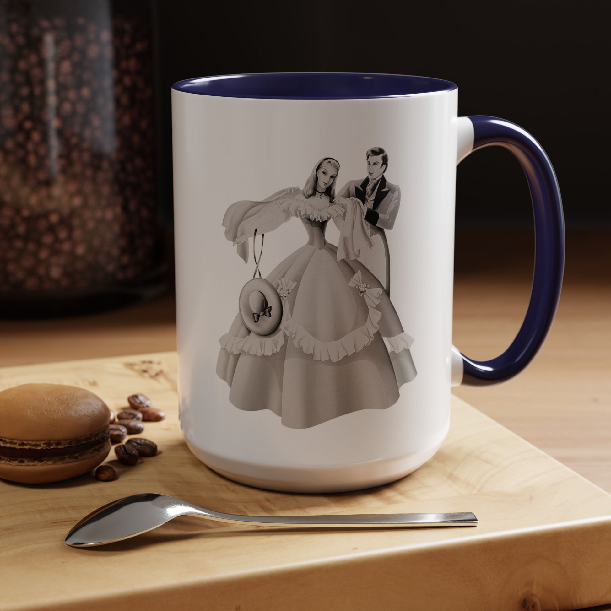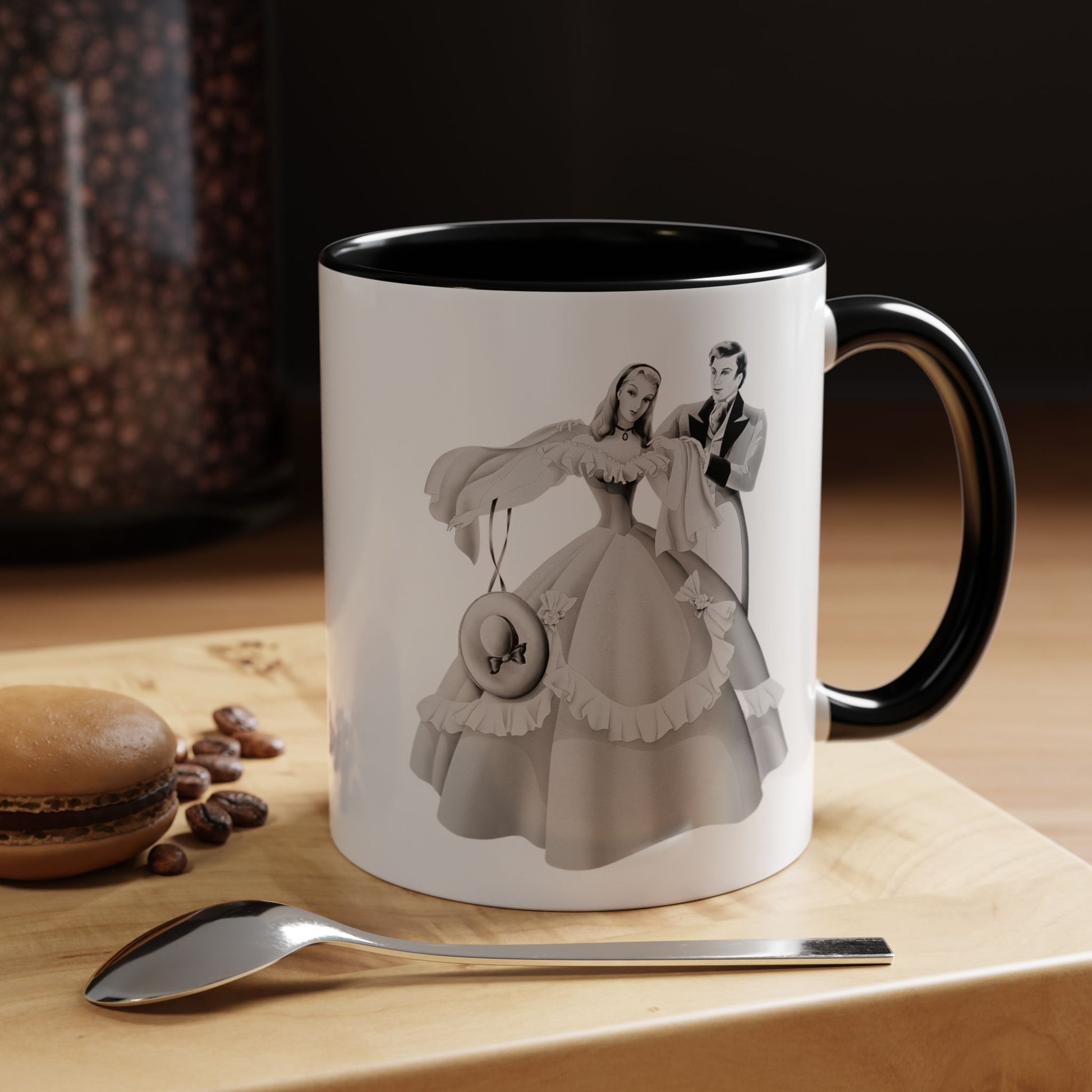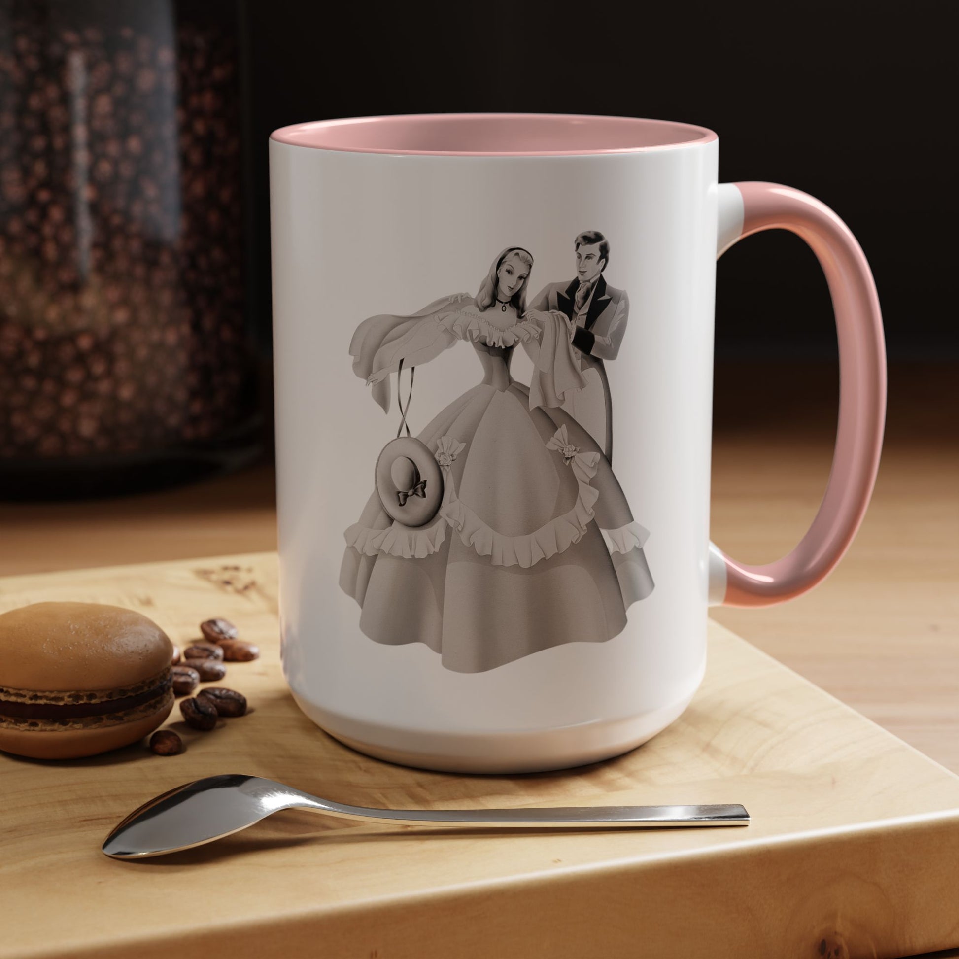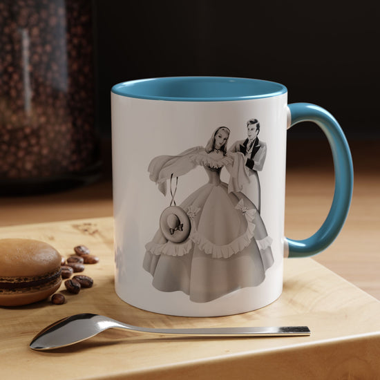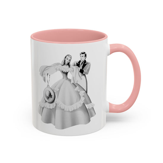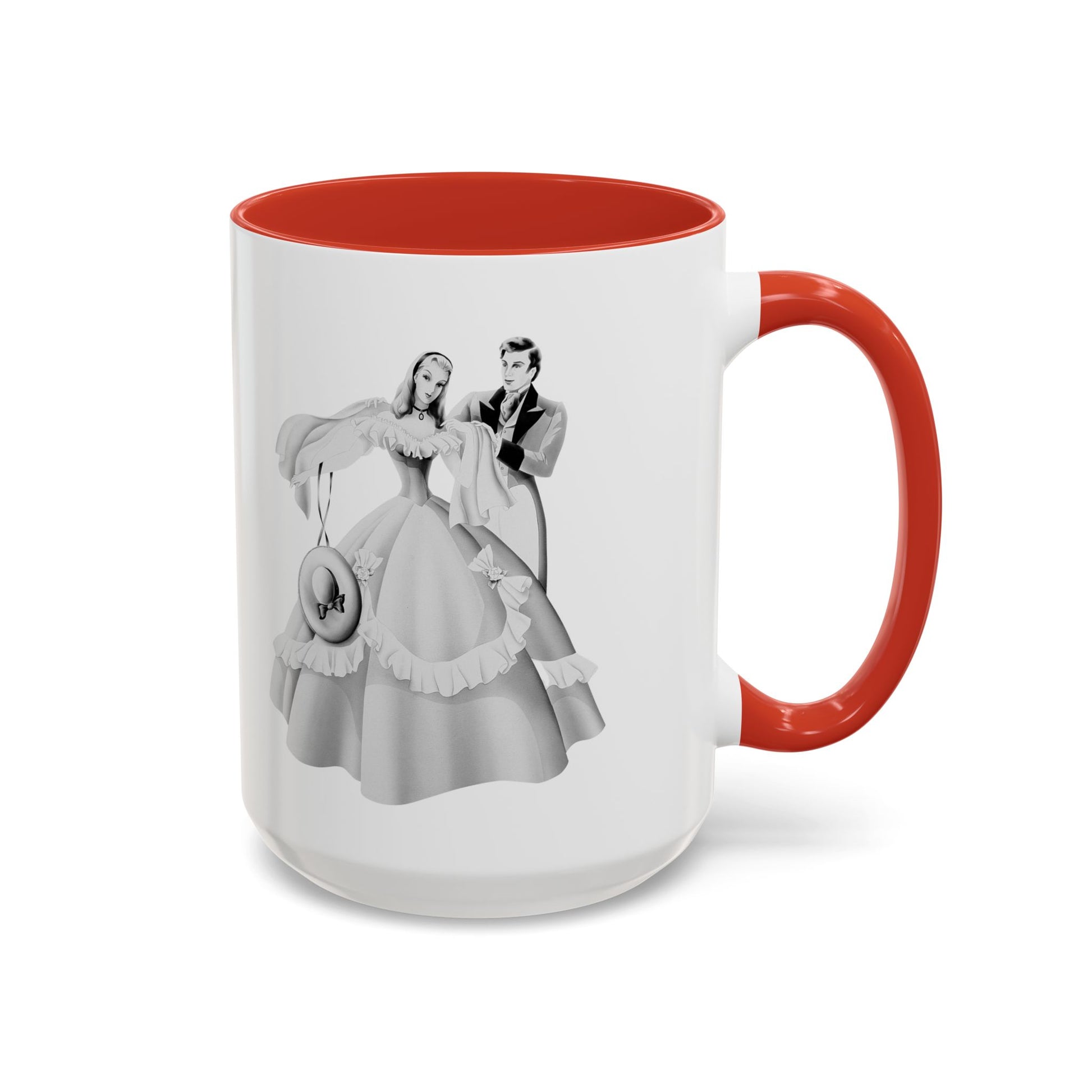 Start your day with vintage romance! This ceramic mug features an exquisite 1940s airbrushed portrait of an elegant couple with lady in pink, from the Turner Wall Accessory archive.