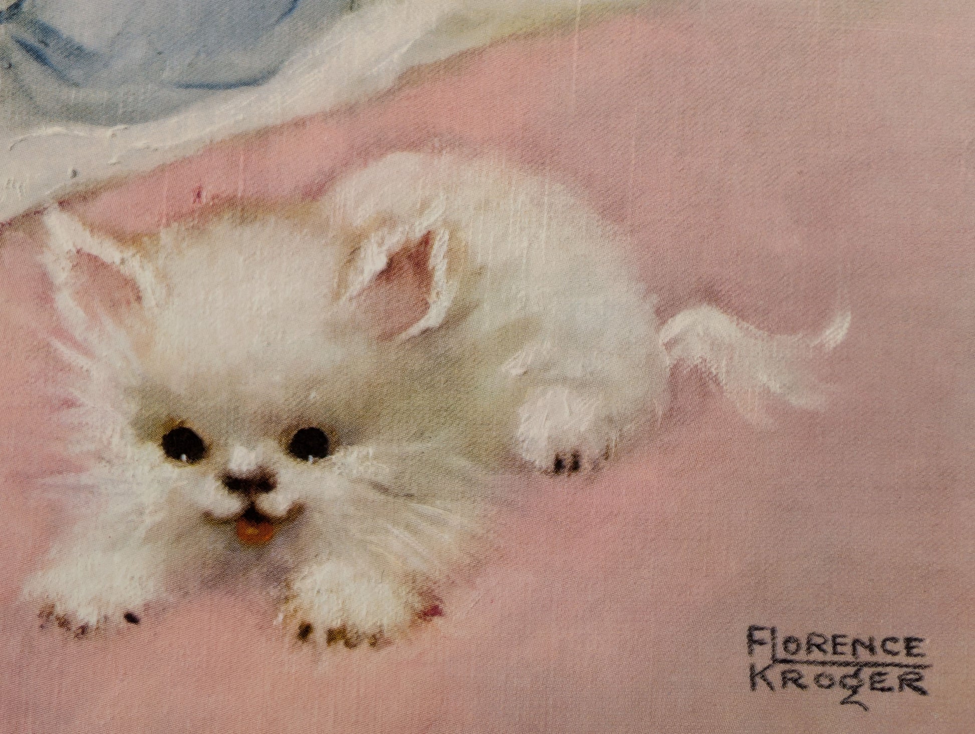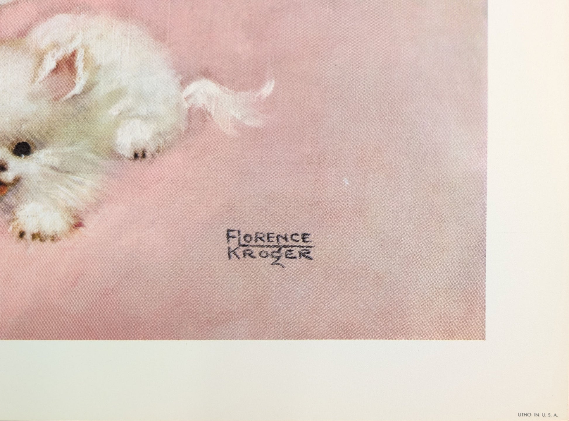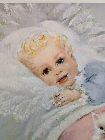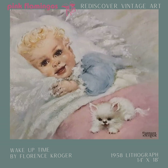This original offset lithograph, printed in 1958, captures a serene nursery moment: a golden-haired baby awakens on a bed of lacy white ruffles, propped on a plush white cushion and greeted by a fluffy white kitten nestled at the edge. Florence Kroger’s cool pastels and tender expressions are perfectly suited for vintage-style nursery décor.