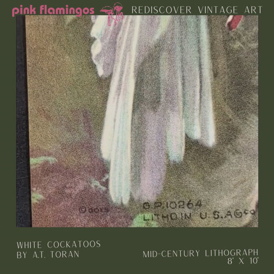 This charming vintage lithograph, "White Cockatoos" by A.T. Toran, brings the elegance of tropical birds into a lush floral setting. Printed in the 1970s or earlier by Goes Lithographing, the image features two white cockatoos with delicate yellow crests, surrounded by deep green foliage and vibrant red blooms—classic mid-century tropical flair in a compact format.