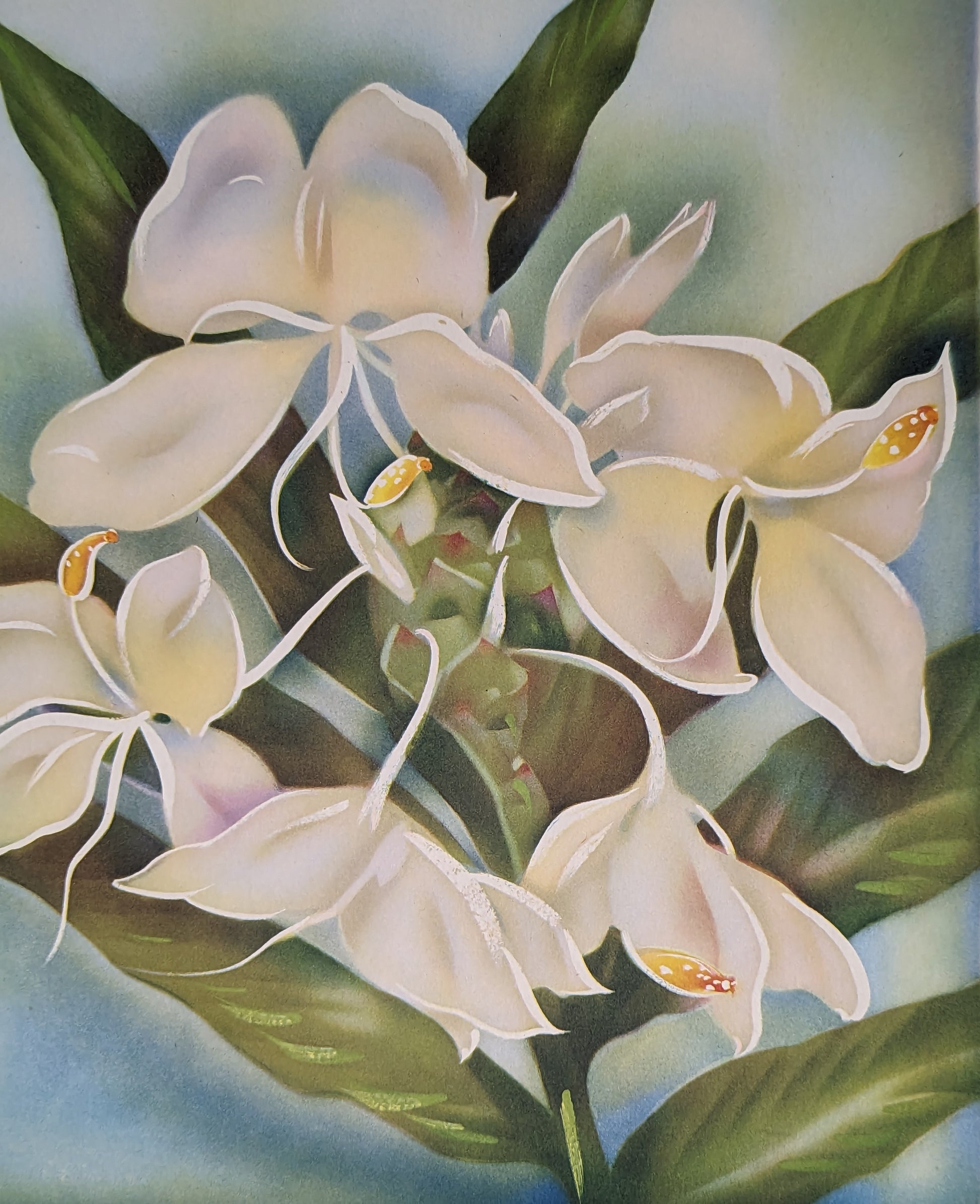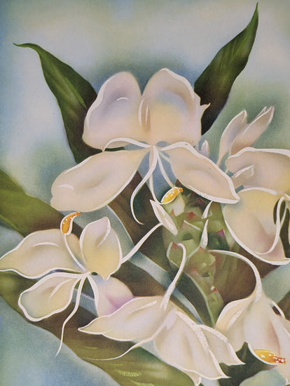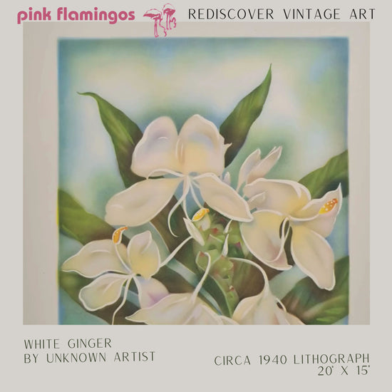 Celebrate the lush elegance of Hawaii’s flora with this mid-century lithograph of the White Ginger. Printed in the 1950s and preserved in mint, uncirculated condition, this 20 × 15 inch artwork captures the delicate white blossoms and rich green leaves of this tropical favorite. Its refined beauty brings a timeless island atmosphere to any space, whether displayed on its own or in a collection.
