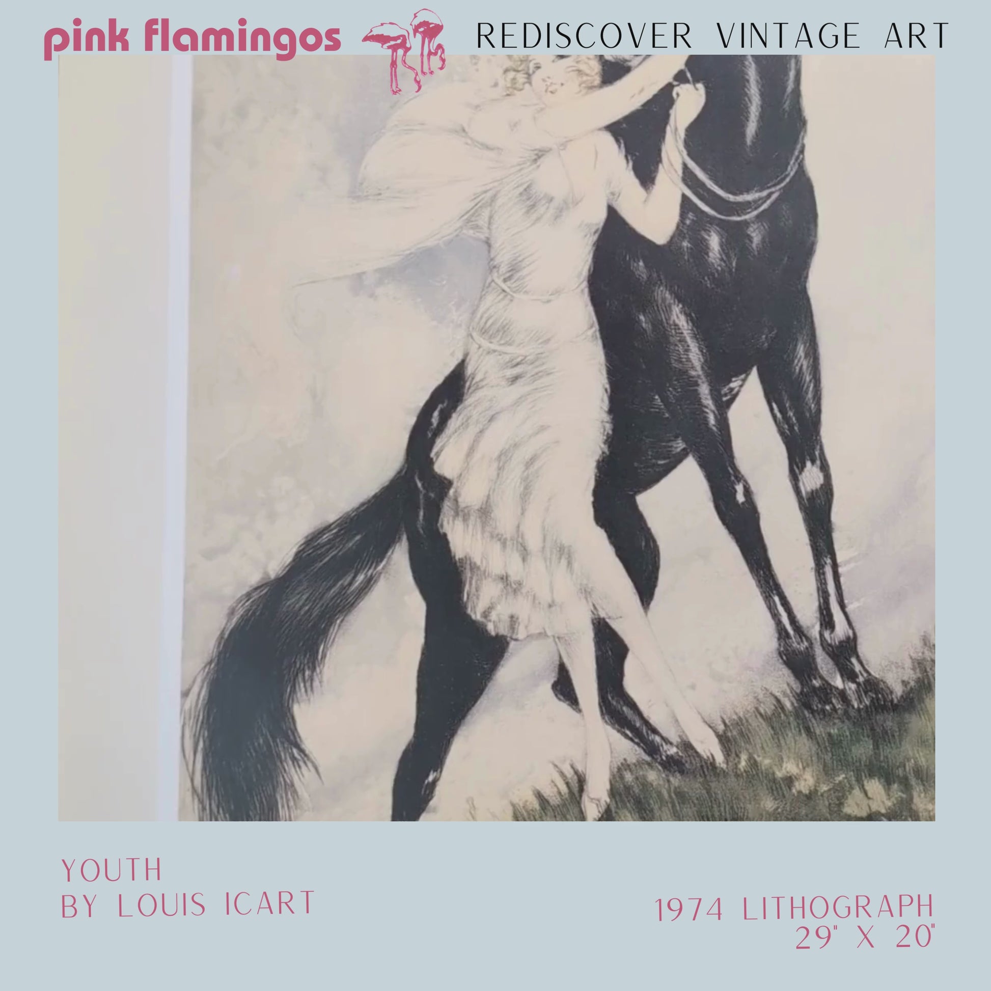 First published in 1930, Louis Icart’s Youth depicts a carefree young woman caught in a moment of joyful energy as she holds tightly to a spirited black horse. This 1974 offset lithograph reproduction preserves Icart’s signature blend of motion, grace, and Art Deco elegance in a striking, oversized format.